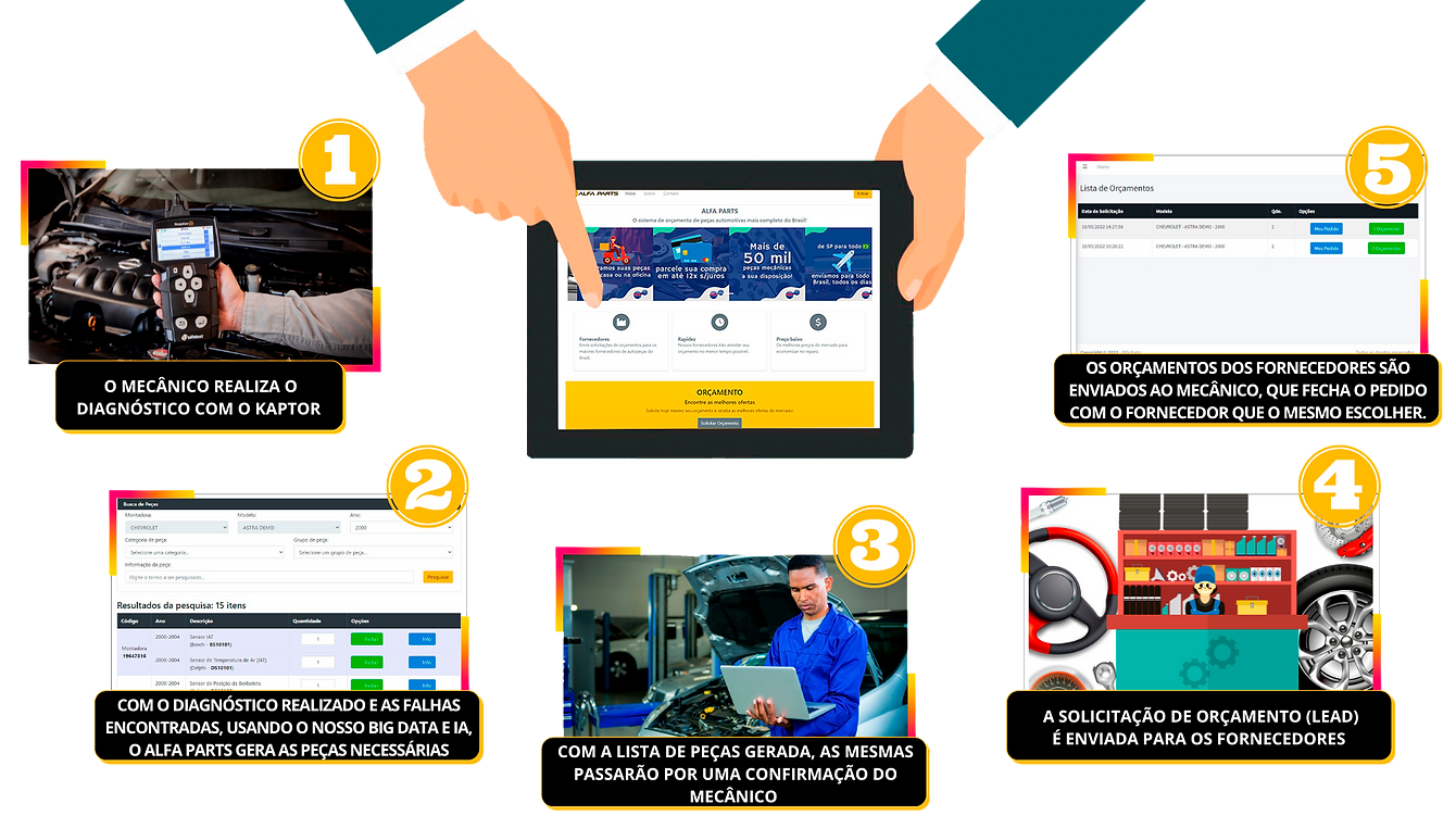 O SISTEMA DE INDICAÇÃO E ORÇAMENTO DE PEÇAS AUTOMOTIVAS MAIS COMPLETO E EFICIENTE DO BRASIL. O QUE É? UMA PLATAFORMA WEB COM SISTEMA DE ORÇAMENTO DE PEÇAS AUTOMOTIVAS Uma solução Alfatest desenvolvida para o mercado de AUTOPEÇAS com a utilização do nosso BIG DATA e IA, com foco na cadeia de fornecimento, para aumentar a produtividade e a eficácia do processo de vendas para o reparador. |